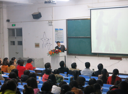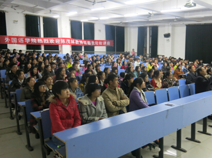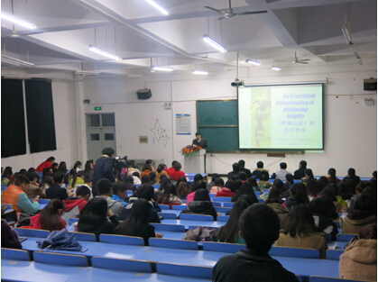 2015年11月6日星期五晚7时,杭州师范大学博士生导师陈茂林教授在文华楼阶四,为大家带来一场以“回归自然,返璞归真----《呼啸山庄》的生态批评”为题的精彩的学术讲座。本次讲座由beat365中文官网科研外事处主办,beat365承办。beat365副经理王长虹主持此次讲座,胡天赋教授、贾炳兴教授等骨干教师和全体师生一同聆听了这场学术盛宴。