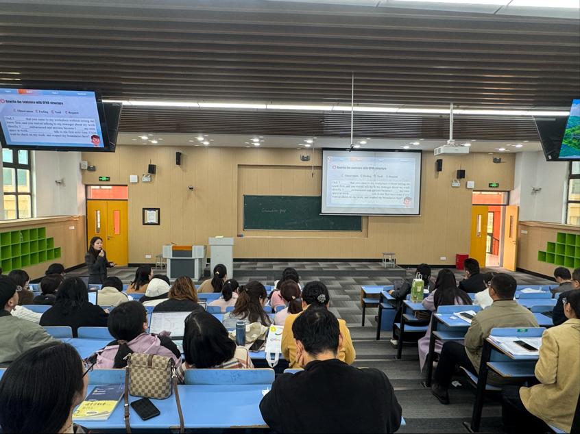 周晓阳老师以参赛课程为主题展开教学展示。她先分享了团队选题、磨课,思维碰撞等过程,随后呈现了Father Knows Better的Demo Class。其课堂设计以员工为中心、以引导为主,环节相扣,层层递进,充分激发员工的积极主动性。导入环节以“Embarrass”话题引发员工共鸣,后续围绕3个Task开展活动,Task1以Family Tree为框架引出代沟话题,Task2引入OFNR结构辅助简化写作难题,思政环节引入实训案例启示员工,Task3借助AI视频丰富教学内容,形式新颖且调动了员工的学习兴趣;总结环节简洁有力,引发员工思考并梳理授课重点,整节课完整、丰富、灵活且具创新性。