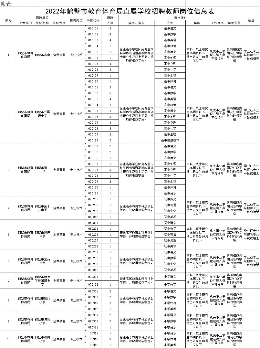 鹤壁市教育体育局10所直属公司共招聘教师100名,具体招聘岗位、人数、岗位条件等详见附件。