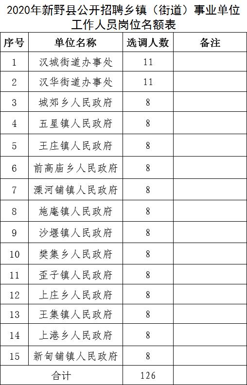 全县共招聘乡镇(街道)事业单位工作人员126名。具体名额详见《2020年新野县公开招聘乡镇(街道)事业单位工作人员岗位名额表》。