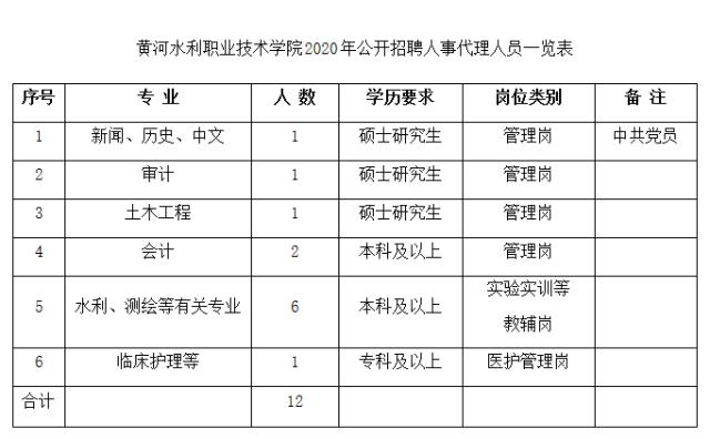 详见《黄河水利职业技术公司2020年公开招聘人事代理人员一览表》(附件)。