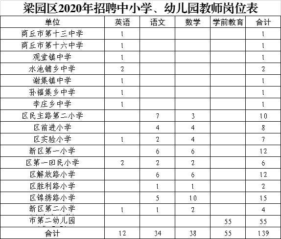 面向社会公开招聘初中英语教师8名,小学英语教师4名,小学语文教师34名,小学数学教师38名,幼儿园专任教师55名。详见《梁园区2020年招聘中小学、幼儿园教师岗位表》(附件1)。