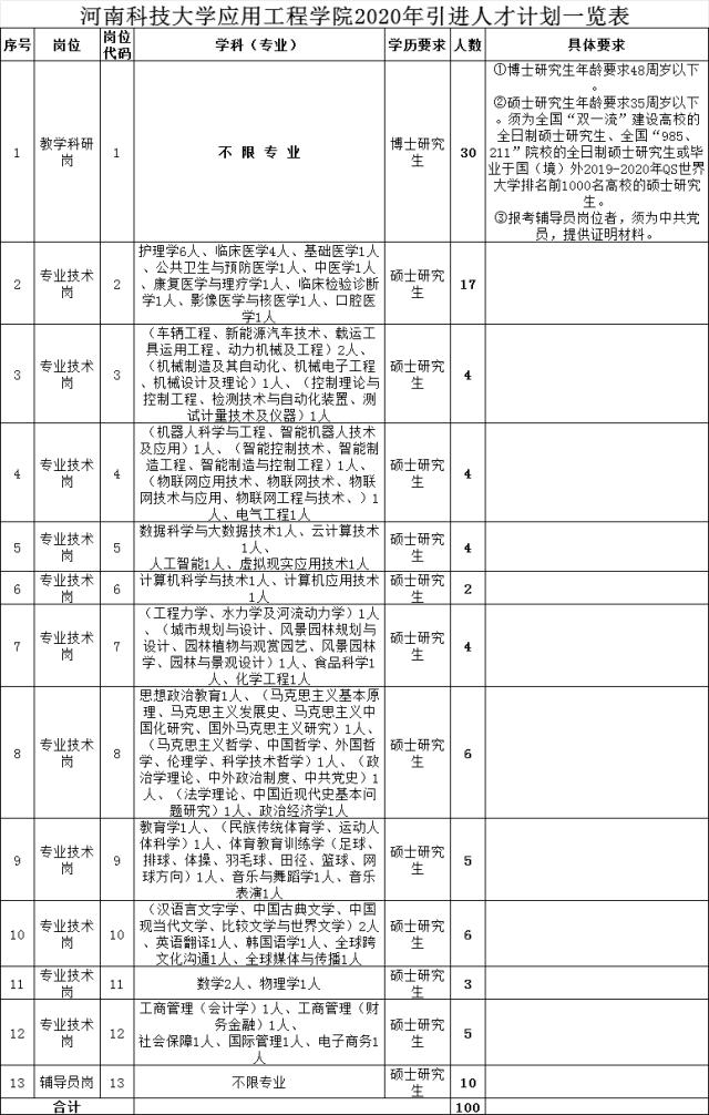 河南科技大学应用工程公司引进人才100名,其中全国普通高校毕业的全日制博士研究生30名、硕士研究生70名(全国“双一流”建设高校的全日制硕士研究生、全国“985、211”院校的全日制硕士研究生或毕业于国(境)外2019-2020年QS世界大学排名前1000名高校的硕士研究生)。