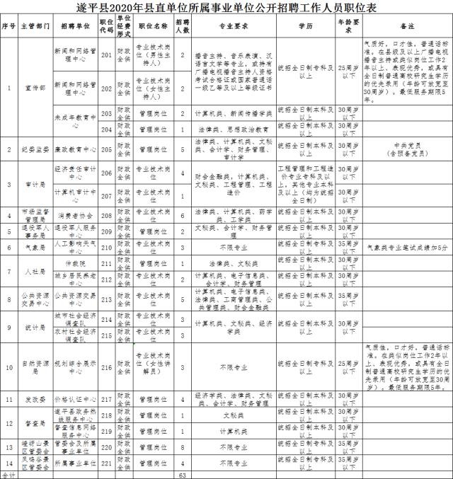 根据编制、职位空缺情况和实际工作需要,县直单位所属事业单位公开招聘工作人员63名。