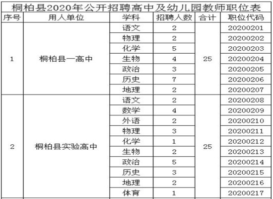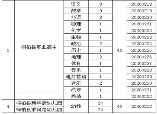 本次共招聘高中教师及幼儿教师130名,其中高中教师90名,幼儿教师40。具体招聘职位及名额见《桐柏县2020年公开招聘高中及幼儿教师职位表》(附件3)。