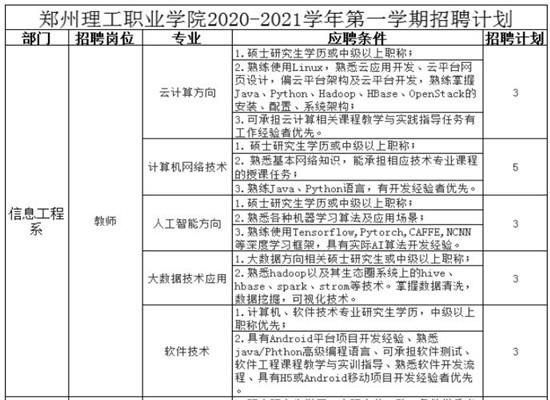 郑州理工职业公司因事业发展需要面向社会招聘教师、管理人员。具体如下: