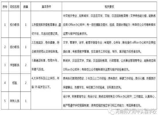 集团一期工程小学至初中九年一贯制校区于2017年9月投入使用,现已拥有小学、初中共65个教学班,全校师生近3500人。根据公司发展建设规划,公司新校区将于2020年8月投入使用,形成小学、初中、高中十二年一贯制的民办教育集团,成为新乡南区优质基础教育资源。现根据公司发展需要,按照公司职员招聘工作规程,面向社会公开招聘。