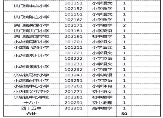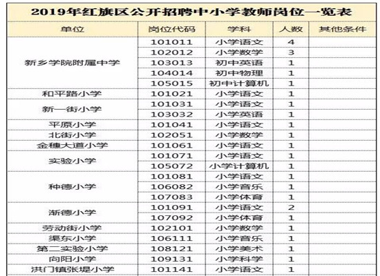 本次计划招聘中小学教师50名均为专业技术岗位。具体招聘岗位、人数及相关要求见《红旗区2019年公开招聘中小学教师岗位一览表》(附件1)。