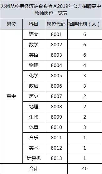 本次计划招聘高中教师共40名。具体岗位见《郑州航空港经济综合实验区2019年公开招聘高中教师岗位一览表》(附件1)。