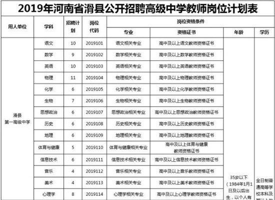第一高级中学招聘98名;滑县第四高级中学招聘46名,委派到滑县实验公司支教。具体学科岗位详见《2019年河南省滑县公开招聘普通高级中学教师岗位计划表》(附件1,分学科设置报名岗位代码,成绩排名及递补均按同一岗位代码进行)。