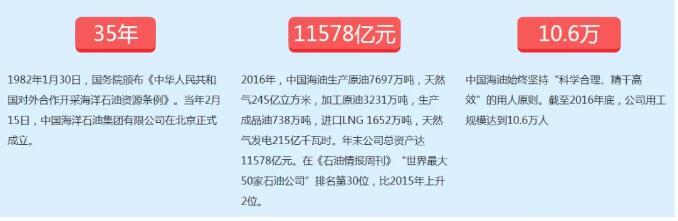 中国海洋石油集团有限公司是中国国务院国有资产监督管理委员会直属的特大型国有企业,是中国最大的海上油气生产商。公司成立于1982年,总部设在北京。经过30多年的改革与发展,中国海油已发展成为主业突出、产业链完整、业务遍及40多个国家和地区的国际能源公司。公司形成了油气勘探开发、工程技术与服务、炼化与销售、天然气及发电、金融服务等五大业务板块,可持续发展能力显著提升。2017年,公司在《财富》杂志“世界500强企业”排名中位列第115位;在《石油情报周刊》杂志“世界最大50家石油公司”排名中位列第30位,比2015年上升2位。截至2016年底,公司的穆迪评级为Aa3,标普评级为A+。