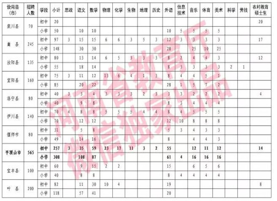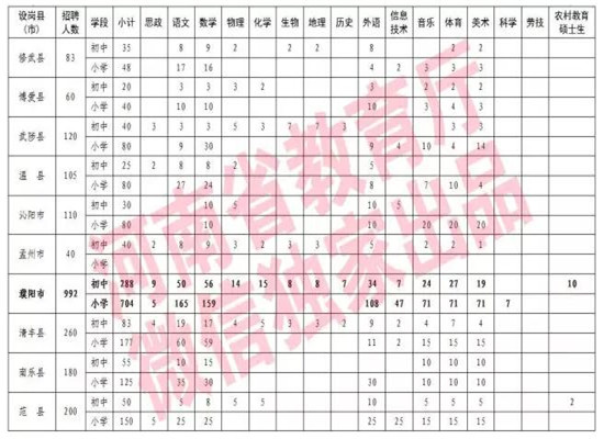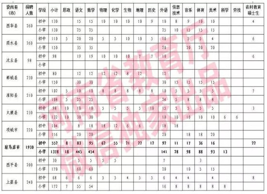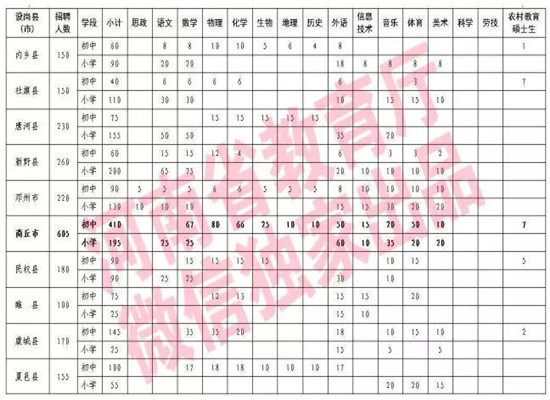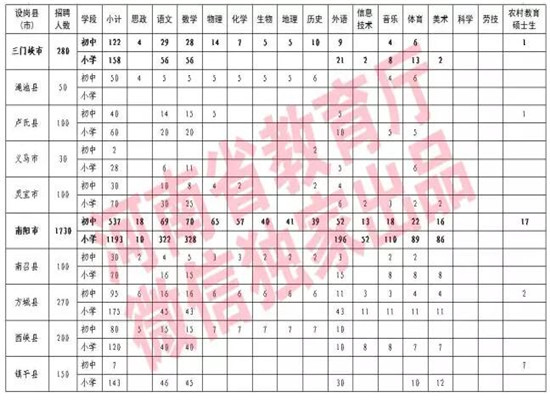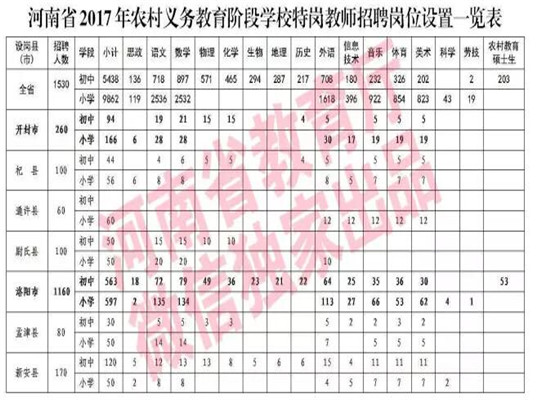 2017年全省共招聘农村特岗教师15300名,其中,初中特岗教师5438名,小学特岗教师9862名。具体岗位设置参见《河南省2017年农村义务教育阶段公司特岗教师招聘岗位设置一览表》(文末附)。