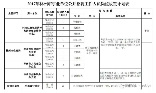 此次招聘面向林州市管理的老员工村干部(含第一批)招聘街道办事处所属事业单位工作人员25名,面向社会招聘其它事业单位工作人员20名。具体招聘单位、岗位、数量、资格条件详见下表: