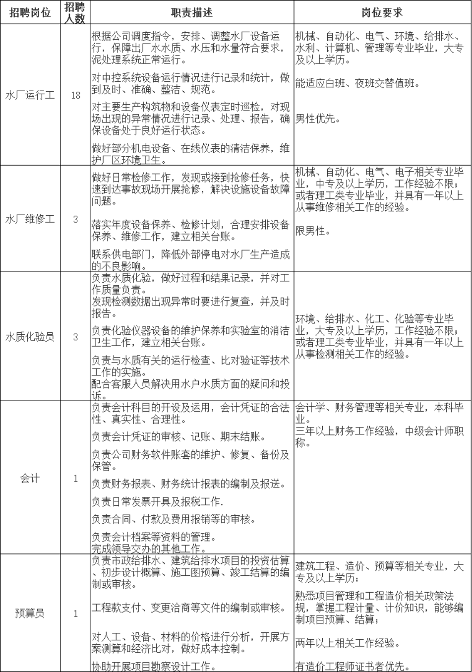 水厂运行工18人,水厂维修工3人,水质化验员3人,会计1人,预算员1人。