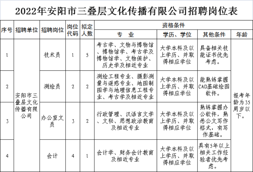 各职位要求详见《2022年安阳市三叠层文化传播有限公司招聘岗位表》(附件1)。