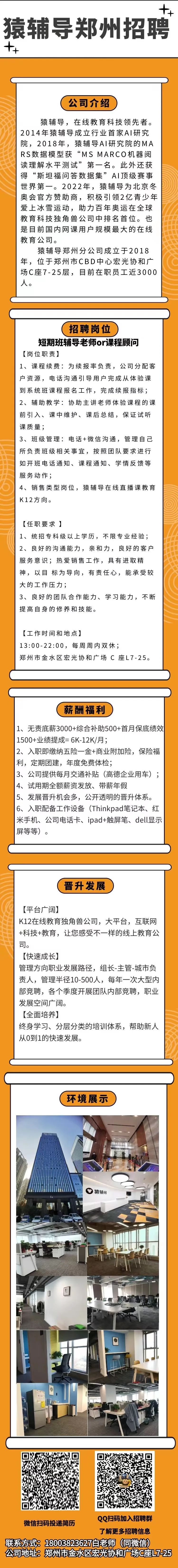 郑州!月薪6-12K!五险一金!双休!专科及以上!猿辅导校园招聘