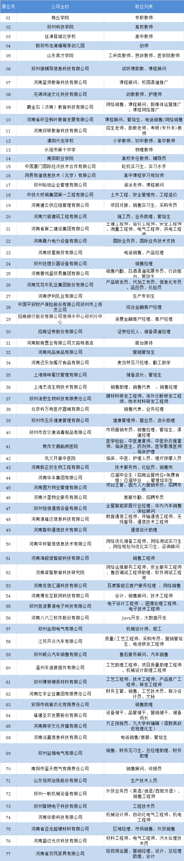 ◀咨询电话▶0371-61179336、61179358截至目前,河南省第二建设集团有限公司、郑州科技公司、南阳职业公司、中国厦门国际经济技术合作有限公司、山东恒邦冶炼股份有限公司、网易有道信息技术(北京)有限公司、郑州金阳电气有限公司、河南典学文化传播有限公司、河南花花牛乳业集团股份有限公司、巩义开普中医院等80余家国有企业、教育机构和知名企业参会,提供岗位3000余个。用人单位持续报名中……