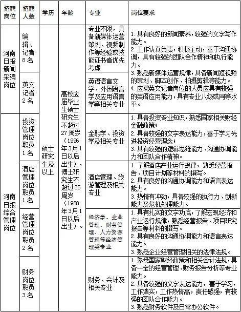根据事业发展需要,诚聘优秀大学毕业生到河南日报社工作,欢迎报考,具体事宜如下: