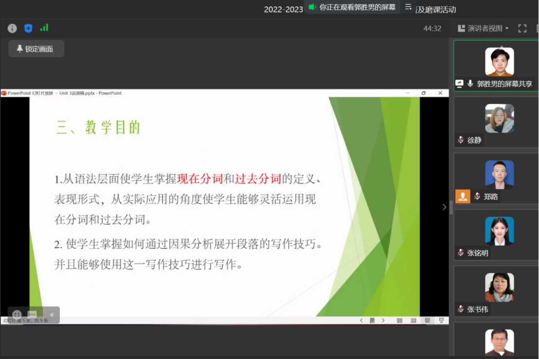 会议开始,郑老师强调教研室全体教师须高度重视教学大练兵活动,新老教师齐奋进,进一步提高教师队伍公司产品能力和水平,提高课堂教学质量。接下来,青年教师代表张铭明和郭胜男两位老师依次对所教课程进行了说课展示。张老师针对Unit 3 Romance整个单元,分享了自己的教学设计,并将其对课程的理解以及开展教学活动时的具体步骤进行了细致说明。郭老师从Animation and Comic单元的语法和写作部分出发,结合员工特点,从多维层面阐述了教学设计,并从员工为本的角度开展了案例说明。