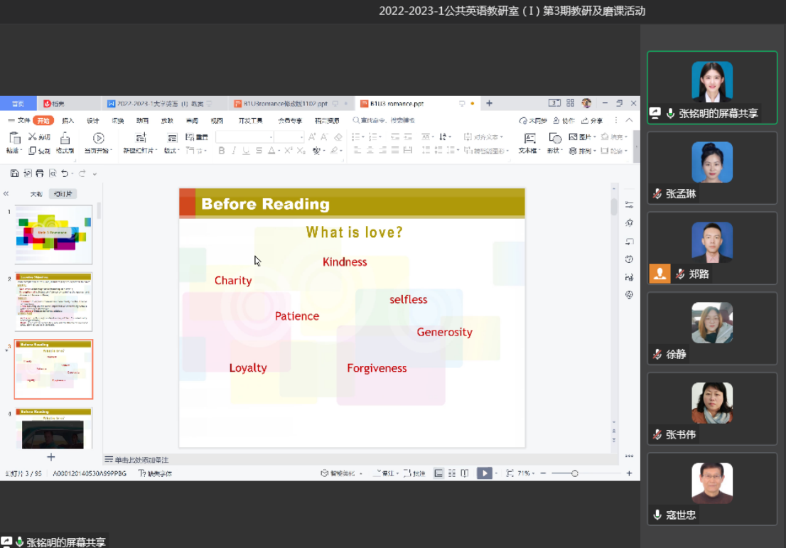 (文/张孟琳)为响应beat365“精细化管理”工作思路,实现教学“提质增效”目标,经教研室主任马利娜老师统筹安排,10月11日下午,公共英语教研室(I)通过腾讯会议召开了本学期首次教学大练兵活动。本次会议由教研室副主任郑路老师主持。