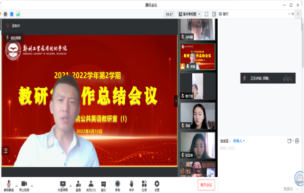 (文/张孟琳)为更好地总结本学期的教研教学工作,同时为确保下学期各项工作的顺利开展实施,6月10日上午10时,公共英语教研室(I)在线上召开题为“2021-2022学年第2学期教研室工作总结会议”的教研活动。本次活动由教研室副主任郑路老师主持,教研室全体教师参加。