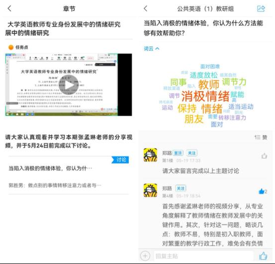 本次教研活动主要针对大学教师的情绪体验进行研讨。研究发现,教学中的人际互动及关爱伦理影响着教师情绪,而教师情绪的调节和管理也影响到教师的专业身份认同,可以说情绪是外语教师身份发展的重要维度。老师们通过学习通平台观看教研内容,并在学习通内参与“云讨论”,根据自身的实际情况探讨解决消极情绪的有效方法。