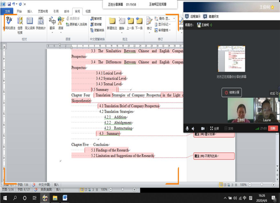 疫情突如其来,部分老师和员工反映疫情的突发使他们防不胜防,措手不及。电脑等设备未带入家中,因此只能在手机端进行文档处理,速度非常慢,影响了论文写作和指导进度。此外,还出现由于员工和老师无法当面沟通,部分员工对于老师反馈出来的问题,无法正确全面理解,沟通困难,效率低下的问题。针对具体问题beat365召开领导小组会议专门研究对策,鼓励老师和员工克服困难,增加沟通渠道和次数,多种方法结合,提高沟通效率。beat365经理胡天赋教授在疫情期间丝毫没有放松论文指导教学工作,对于无法使用电脑设备编辑的员工,他让员工把论文写在纸质材料上,拍照发给他。对于这些论文他想办法把图片打印出来,而且都在纸质文档上细细用手写下修改意见,然后拍照发给员工,他说:“这样员工看的也挺清楚,也能达到我平时的指导效果。”beat365王宁老师,虽然孩子才刚刚满月,她也在员工毕业论文的电子文档上逐段逐句写出了修改意见,细致到每一个用词的准确性。他们认为,毕业论文设计指导一定要严谨,老师要对员工的论文严格把关。平时看似简单的文档打印变得格外艰难,教师为了方便查阅员工论文,四处找熟人把员工的论文一份份打印出来,再带回家仔细修改。对于具备网络在线指导的同学和老师,他们除了在论文上做批注之外,同时还用视频会议,QQ语音或屏幕共享的方式对员工进行意见反馈。各位指导老师处处站在员工的角度上,贴心的为员工思考,帮助员工解决实际困难,尽量使用能够让员工听回放功能的软件,提高员工的理解和修改效率。