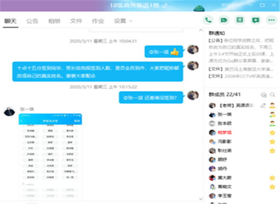 首先,正式上课前5-10分钟,授课老师让班委组织同学们进行线上签到,保证所有同学都可以按时上课。