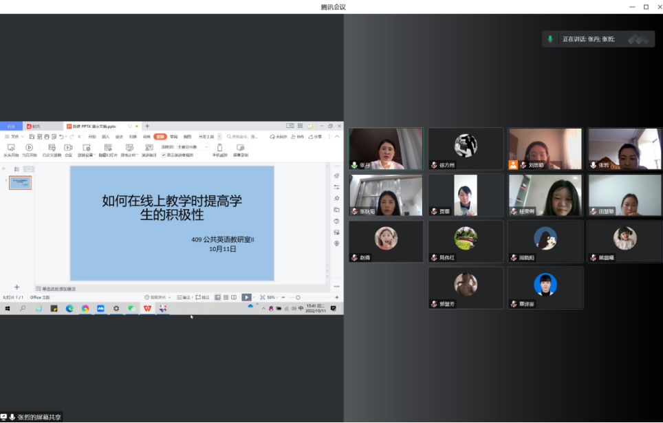 (文/熊晨曦)为进一步规范线上课程教学管理,加强线上教学纪律性,确保线上教学质量和效果,公共英语教研室(II)于10月11日下午15:00-16:00开展题为“如何在线上教学时提高员工参与课堂的积极性”的教研会议。