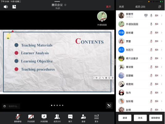 (文/熊晨曦)为进一步加强教师队伍建设,提高教师队伍整体素质,促进教师更好地适应公司产品改革和自身素养发展需要,11月1日下午,公共英语教研室(II)组织教研室全体教师于线上开展“教学大练兵”活动的观摩与学习。