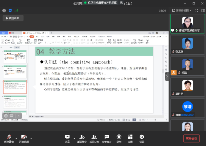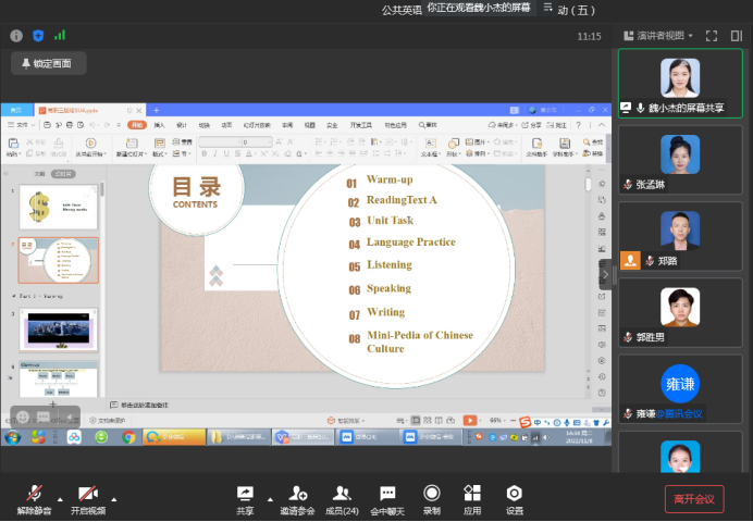 会议开始,魏小杰老师以《创新高职英语基础教程(I)》第四单元的Money Works为题,教学思路清晰,教学设计有层次,对教材重难点把握准确,从听、说、读、写和语言运用等方面入手,综合培养员工的学习能力。曹晓芹老师以《E英语教程智慧版(III)》第四单元的语法和写作部分为主,从教材分析、教学目标、教学重难点、教学方法及教学步骤五部分进行了说课。曹老师所采取认知法和任务型教学法,展示了以员工为中心的教学思想。