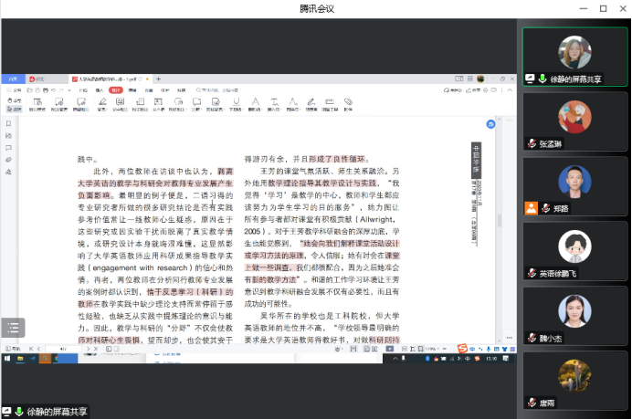 徐老师分享结束后,参会教师结合自身实际教学,围绕“教学与科研融合”这一主题进行讨论。本次教研会使教师认识到无论是“科研学术研究”还是“教学学术研究”,都具有教学实践问题导向的特征,研究问题来源于教学实践,研究成果指导教学