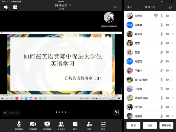 会上,作为教研室校内外活动的负责老师,本次会议的主讲人杨雯俐老师提出,以赛促学很重要,其根本目的在于锻炼员工语言实践应用能力,全面提升员工英语综合水平。因此,大学英语教学中注重以赛促学,需要教师多角度考虑竞赛机制、竞赛内容、竞赛主题等问题,并将其与日常教学、课堂活动、考核评价等不同维度进行有机结合,加强员工参与积极性,促使员工能够客观认知自身英语水平,通过竞赛的方式汲取英语知识与学习经验。