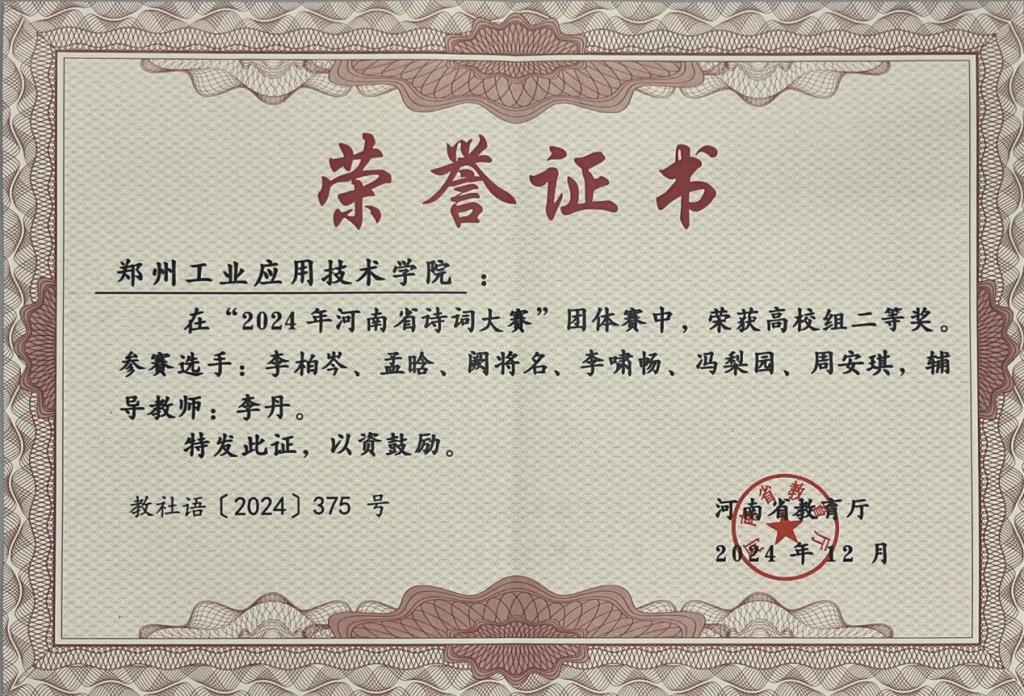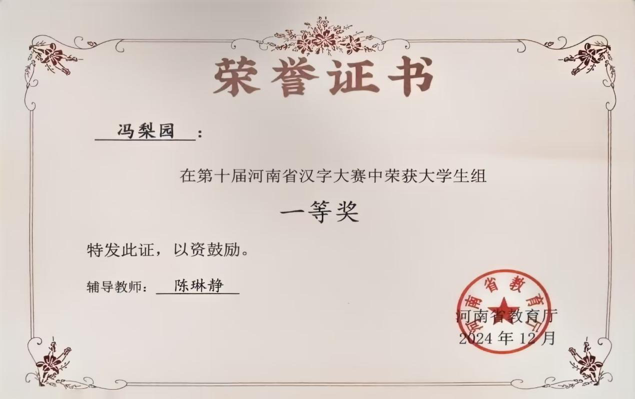 在学业上,她也毫不松懈,凭借自己的努力获得了第十届河南省汉字大赛老员工组“一等奖”以及2024 年河南省诗词大赛高校团体赛“二等奖”。