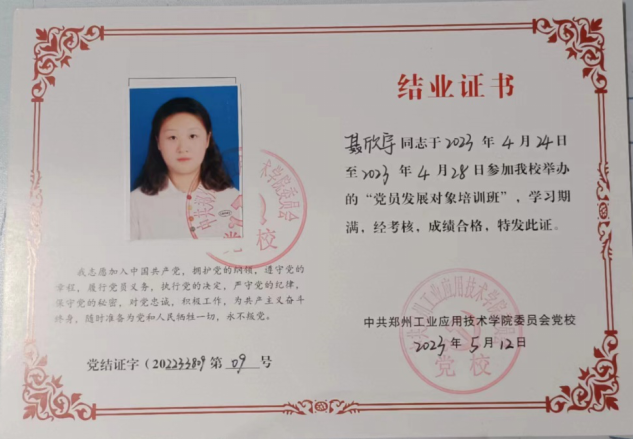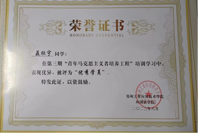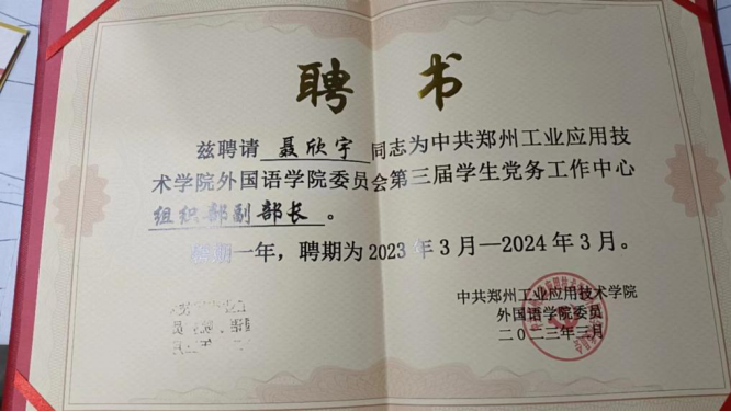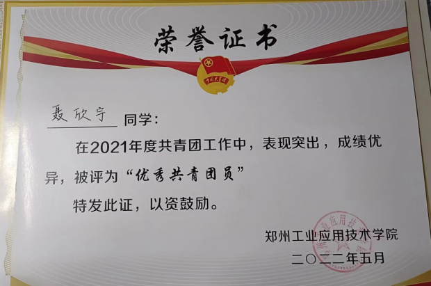 聂欣宇,2021级英语(BK)04班班长,自入学以来,她一直遵守公司的各项规章制度,具有良好的思想道德品质,有强烈的集体荣誉感和工作责任心,各方面表现优秀。