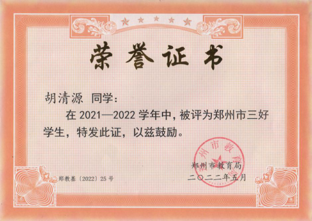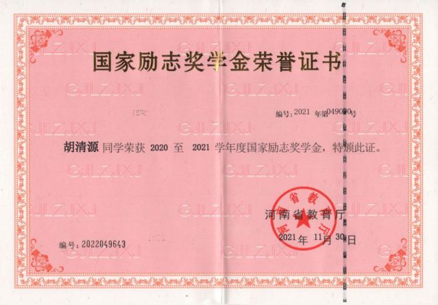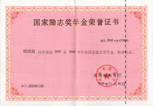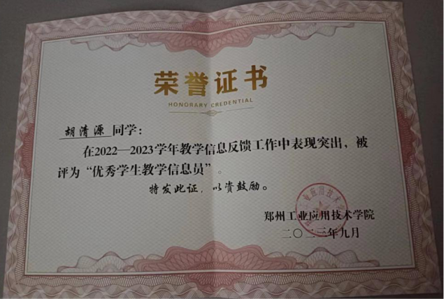 学习方面,该生深知学习是第一要务,有意识培养自身良好的学习习惯,认真对待课内的专业知识学习,积极主动利用网络、图书馆等资源涉猎课外的知识。经过他的不懈努力,综合成绩名列前茅,一次性通过了英语专业四级考试,连续两年获得“国家励志奖学金”,曾获郑州市“三好员工”荣誉称号。