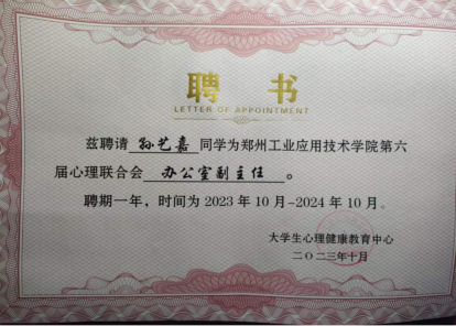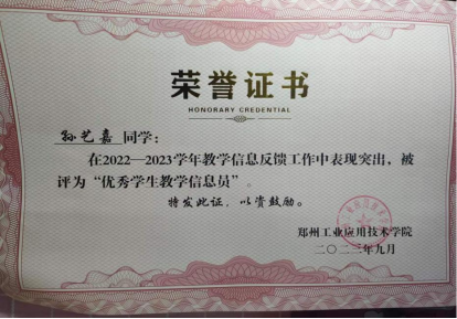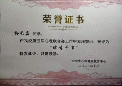 在工作上,她作为学习委员,始终以全心全意为同学服务作为自己工作的出发点,在日常工作中不仅能勤于工作、认真负责,努力为老师和同学们服务,还虚心向别人学习,曾获“优秀教学信息员”荣誉称号。同时,她在校心理联合会担任办公室副主任一职,性格开朗、乐于助人、严以律己、宽以待人,积极参加各项活动,获得老师和同学的一致好评。