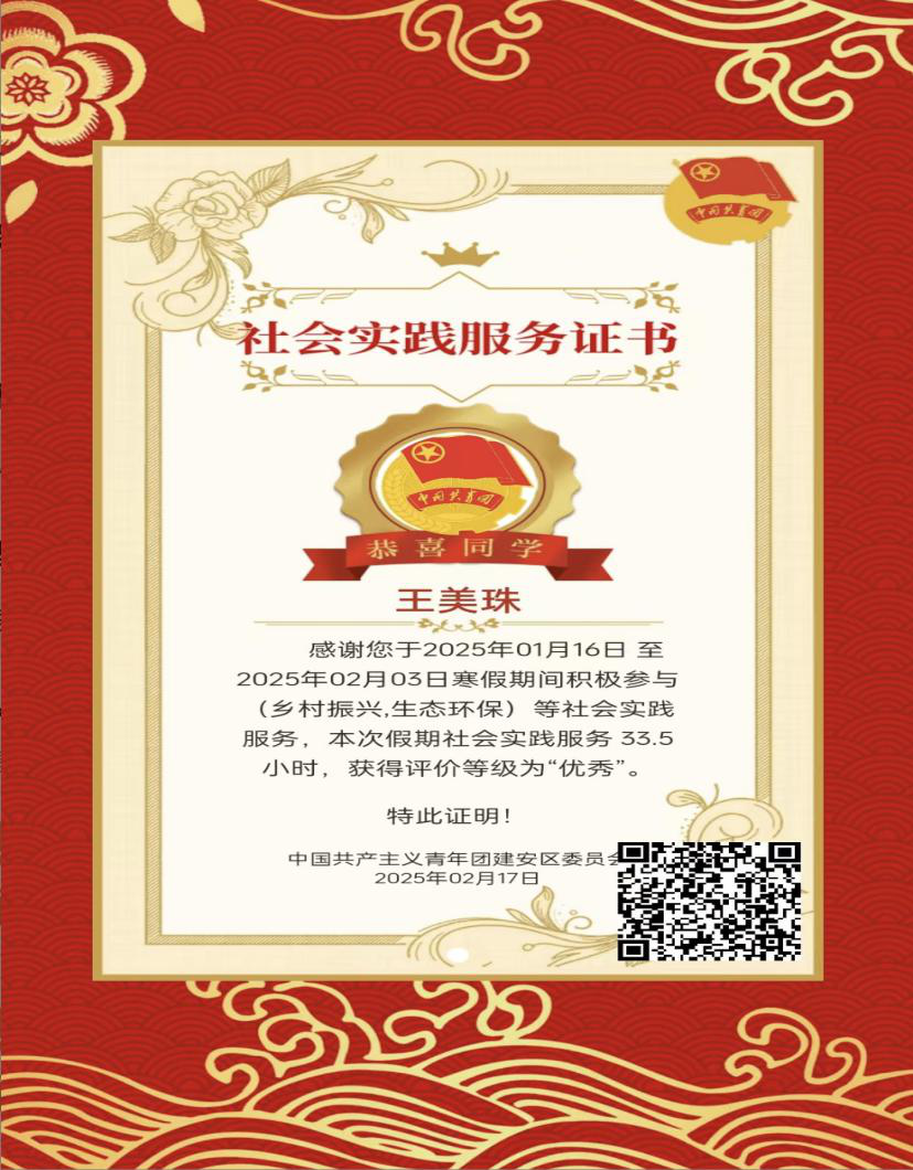 担任班级团支书,工作认真负责,高效组织“青年大学习”、主题团日等活动,主动关心帮助同学,增强了班级凝聚力。积极参与实践与竞赛,投身春运志愿服务;获校级演讲比赛铜奖、表演比赛二等奖等,展现了扎实的专业能力与多元风采。